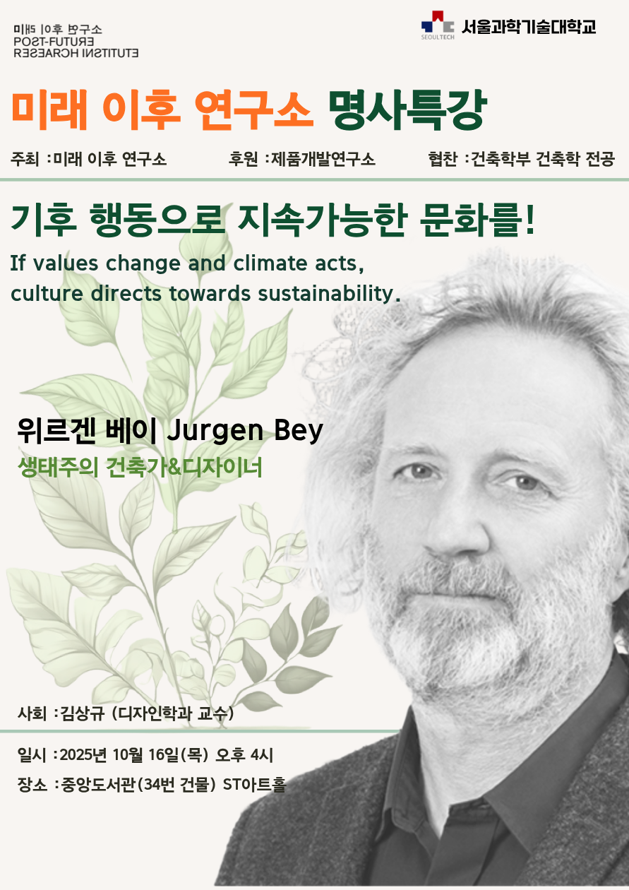 주 제 _ 기후 행동으로 지속가능한 문화를! If values change and climate acts, culture directs towards sustainability. 강연자 _ 위르겐 베이 Jurgen Bey 사 회 _ 김상규(디자인학과 교수) 일 시 _ 2025년 10월 16일(목) 오후 4시 장 소 _ 도서관 ST아트홀(34번 건물) 주 최 _ 미래 이후 연구소 후 원 _ 제품개발연구소 협 찬 _ 건축학부 건축학전공 참 여 _ 교직원, 학생 등 누구나 참석 가능(무료) 문 의 _ 인사대 행정실(6755), futurelab@seoultech.ac.kr