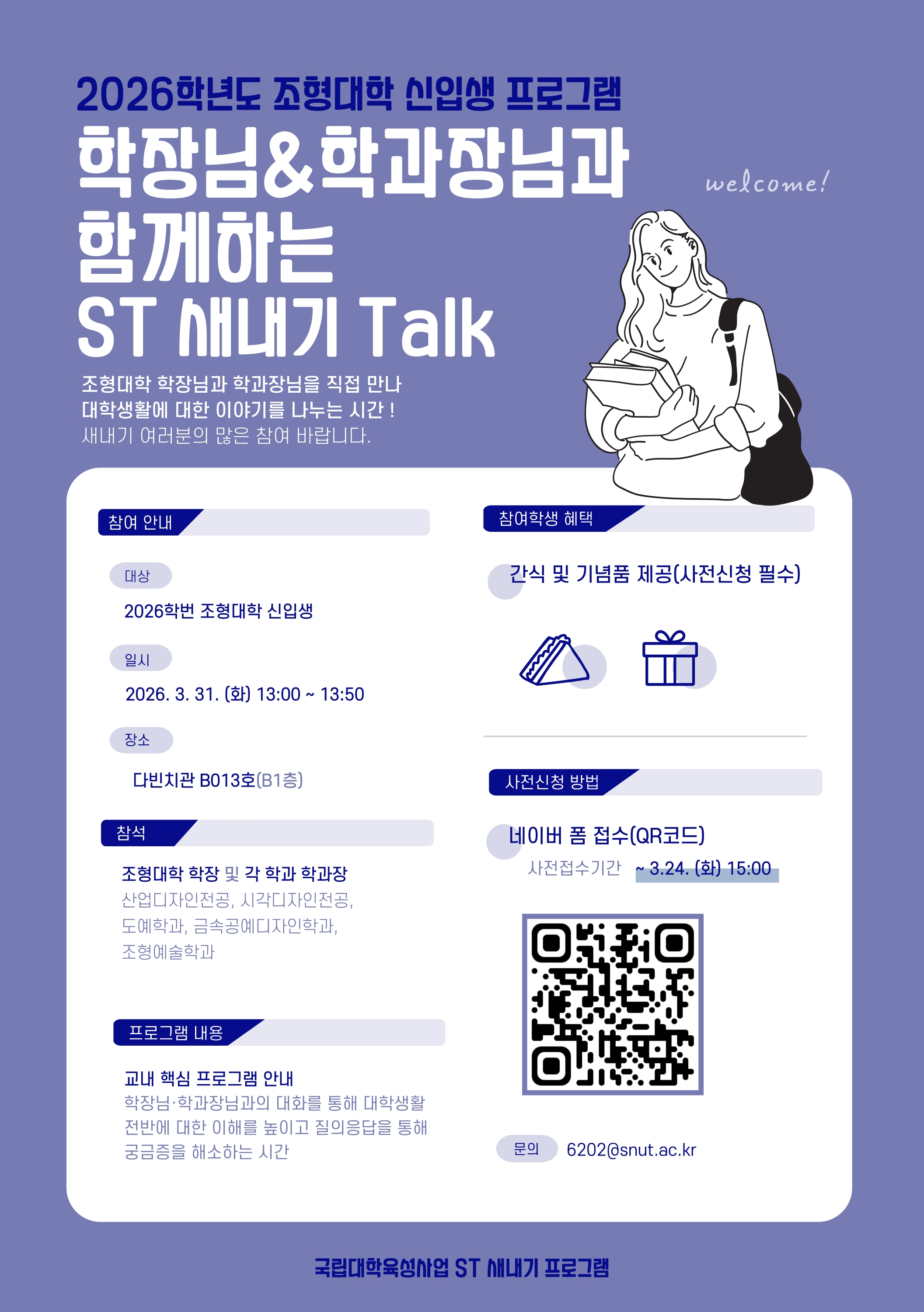 안녕하세요, 조형대학 신입생 여러분! 여러분의 대학 생활 적응을 돕기 위해 ST새내기 프로그램 「학장님 & 학과장님과 함께하는 ST새내기 Talk」 을 진행합니다.